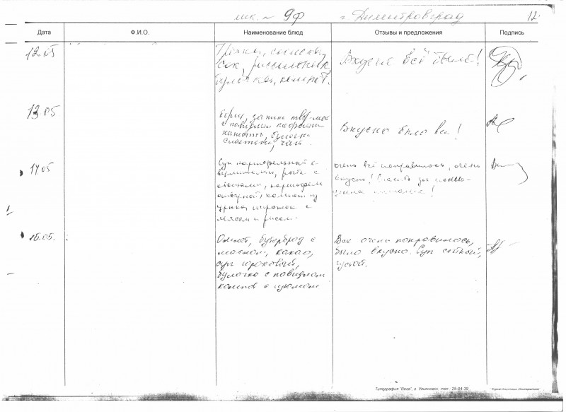 шк. № 17 – (13.05.2015) – «Блюда приготовлены вкусно, температурный режим не нарушен, соответствует возрастным нормам.»